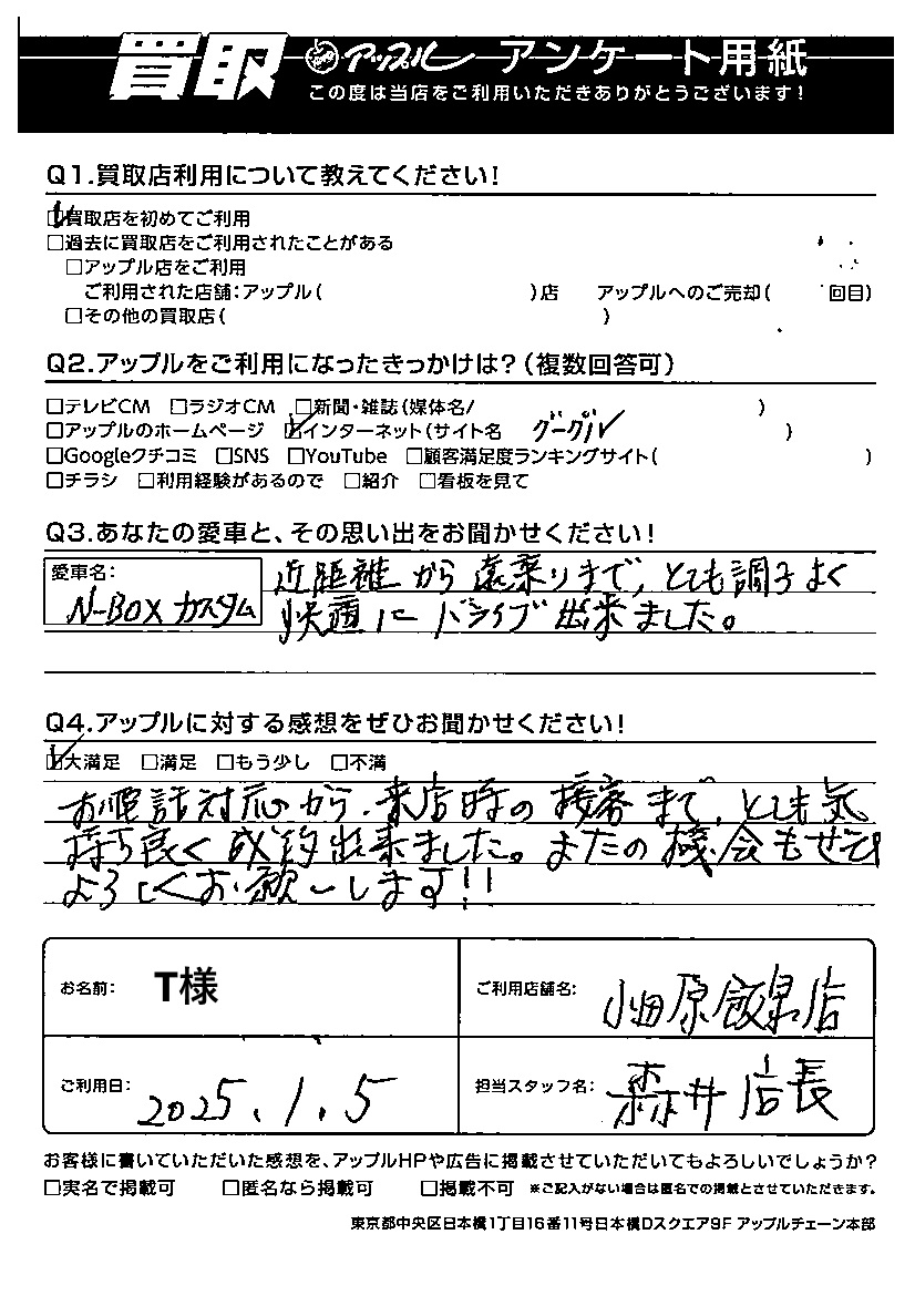 お電話対応から来店時の接客まで、とても気持ち良く成約出来ました。またの機会もぜひよろしく