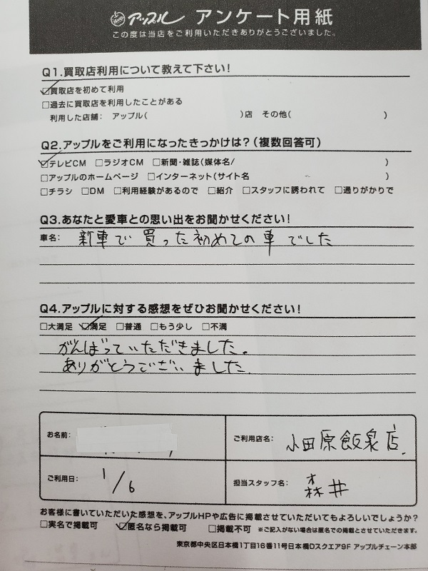 お車のご相談・ 査定だけでもOK! カンタン 入力 30秒 アップルがブランド買取始めました! お電話でも受付中! 受付時間10:00 ~ 19:00 0465-49-5503 お車のご相談・ 査定だけでもOK! カンタン 入力 30秒 アップルがブランド買取始めました! お電話でも受付中! 受付時間10:00 ~ 19:00 0465-49-5503 アップルがブランド買取始めました! お電話でも受付中! 受付時間10:00 ~ 19:00 0465-49-5503 店舗情報 在庫車 スタッフ紹介 ブログ お客様の声 キャンペーン 無料査定 click お客様の声 ご記入日: 2020/01/06 小田原市 T様 車名:マツダ アクセラスポーツ がんばっていただきました。ありがとうございました。 前へ 次へ お客様の声一覧を見る