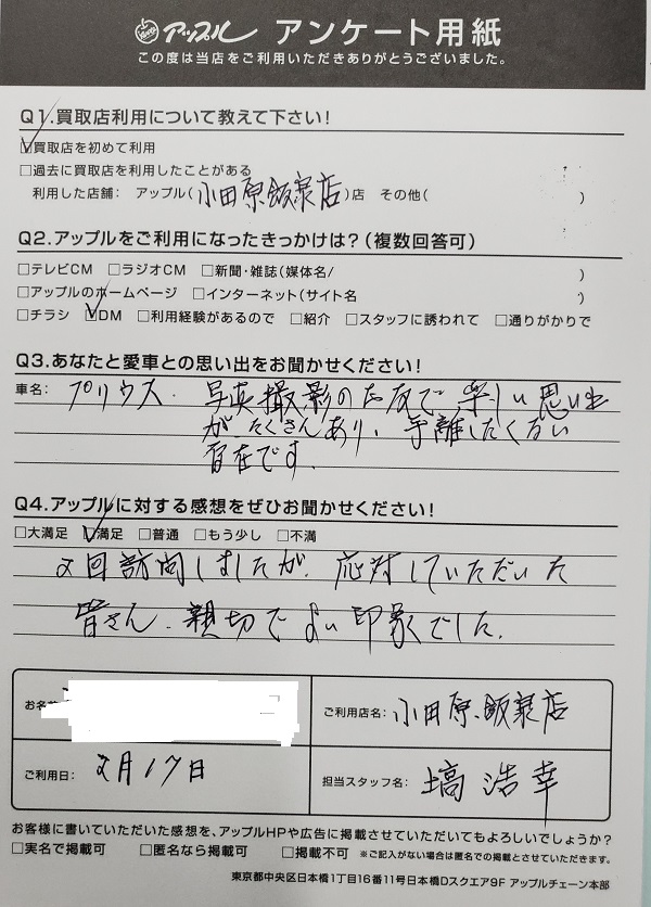 お車のご相談・ 査定だけでもOK! カンタン 入力 30秒 アップルがブランド買取始めました! お電話でも受付中! 受付時間10:00 ~ 19:00 0465-49-5503 お車のご相談・ 査定だけでもOK! カンタン 入力 30秒 アップルがブランド買取始めました! お電話でも受付中! 受付時間10:00 ~ 19:00 0465-49-5503 アップルがブランド買取始めました! お電話でも受付中! 受付時間10:00 ~ 19:00 0465-49-5503 店舗情報 在庫車 スタッフ紹介 ブログ お客様の声 キャンペーン 無料査定 click お客様の声 ご記入日: 2020/02/17 小田原市酒匂 H様 車名:トヨタ プリウス(2023年3月~のPHVを含む) 2回訪問しましたが応対していただいた皆さん、親切で良い印象でした。 前へ 次へ お客様の声一覧を見る