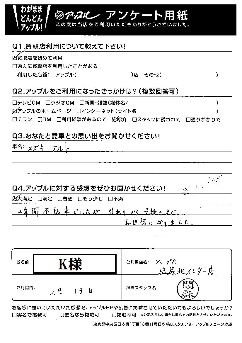 お車のご相談・ 査定だけでもOK! カンタン 入力 30秒 アップルがブランド買取始めました! お電話でも受付中! 受付時間10:00 ~ 19:00 0263-57-8288 お車のご相談・ 査定だけでもOK! カンタン 入力 30秒 アップルがブランド買取始めました! お電話でも受付中! 受付時間10:00 ~ 19:00 0263-57-8288 アップルがブランド買取始めました! お電話でも受付中! 受付時間10:00 ~ 19:00 0263-57-8288 店舗情報 在庫車 スタッフ紹介 ブログ お客様の声 キャンペーン 無料査定 click お客様の声 ご記入日: 2021/02/13 K様 車名:スズキ アルト (2015年12月以降のワークス含む) Q アップルに対する感想をぜひお聞かせください!感想:大満足2年間不動車でしたが、引取りから手続きまでお世話になりました。 前へ 次へ お客様の声一覧を見る