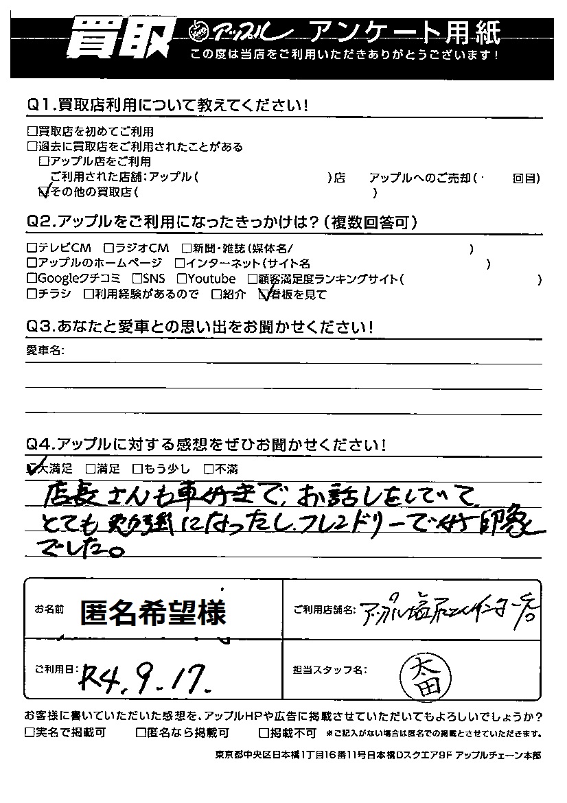 お車のご相談・ 査定だけでもOK! カンタン 入力 30秒 アップルがブランド買取始めました! お電話でも受付中! 受付時間10:00 ~ 19:00 0263-57-8288 お車のご相談・ 査定だけでもOK! カンタン 入力 30秒 アップルがブランド買取始めました! お電話でも受付中! 受付時間10:00 ~ 19:00 0263-57-8288 アップルがブランド買取始めました! お電話でも受付中! 受付時間10:00 ~ 19:00 0263-57-8288 店舗情報 在庫車 スタッフ紹介 ブログ お客様の声 キャンペーン 無料査定 click お客様の声 ご記入日: 2022/09/17 匿名希望様 Q アップルに対する感想をぜひお聞かせください!感想:大満足店長さんも車好きで、お話しをしていてとても勉強になったし、フレンドリーで好印象でした。 前へ 次へ お客様の声一覧を見る