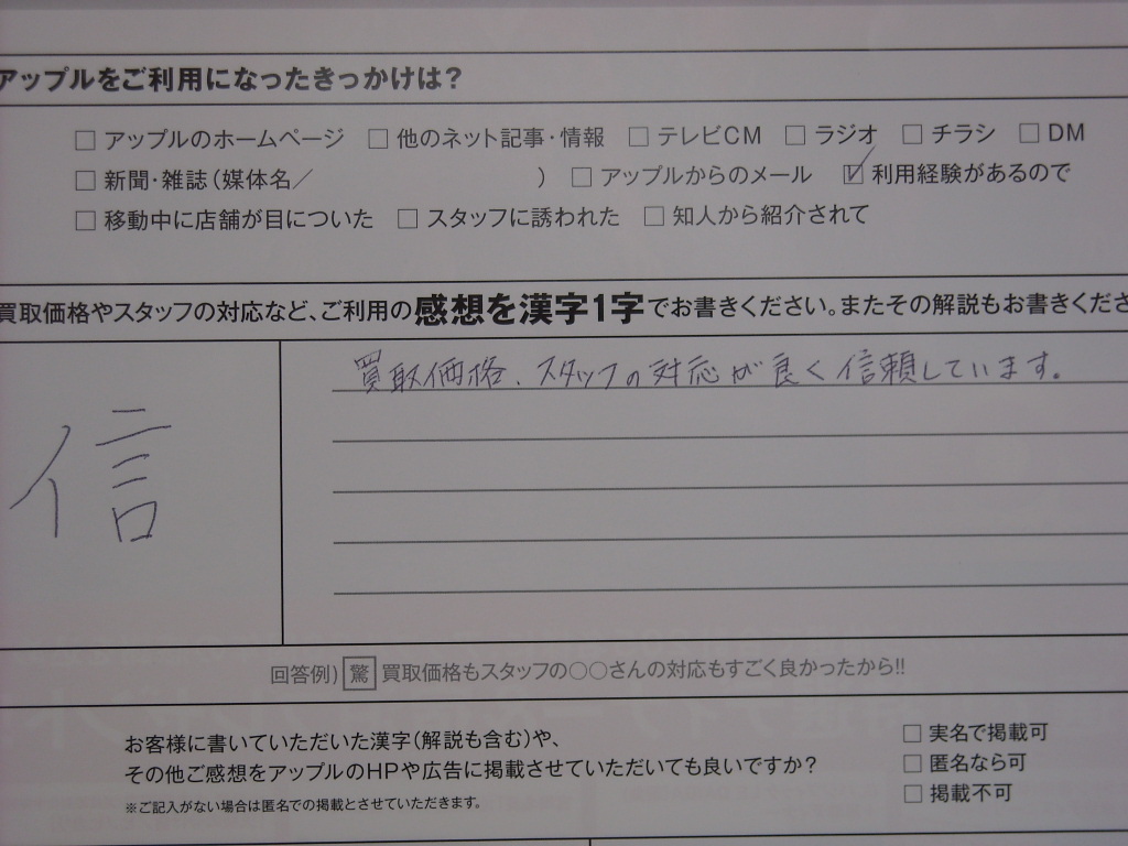 お車のご相談・ 査定だけでもOK! カンタン 入力 30秒 アップルがブランド買取始めました! お電話でも受付中! 受付時間10:00 ~ 18:00最終受付 0438-23-1231 お車のご相談・ 査定だけでもOK! カンタン 入力 30秒 アップルがブランド買取始めました! お電話でも受付中! 受付時間10:00 ~ 18:00最終受付 0438-23-1231 アップルがブランド買取始めました! お電話でも受付中! 受付時間10:00 ~ 18:00最終受付 0438-23-1231 店舗情報 在庫車 スタッフ紹介 ブログ お客様の声 キャンペーン お得 無料査定 click お客様の声 ご記入日: 2009/09/06 I .N様 買取価格、スタッフの対応が良く信頼しています。 前へ 次へ お客様の声一覧を見る