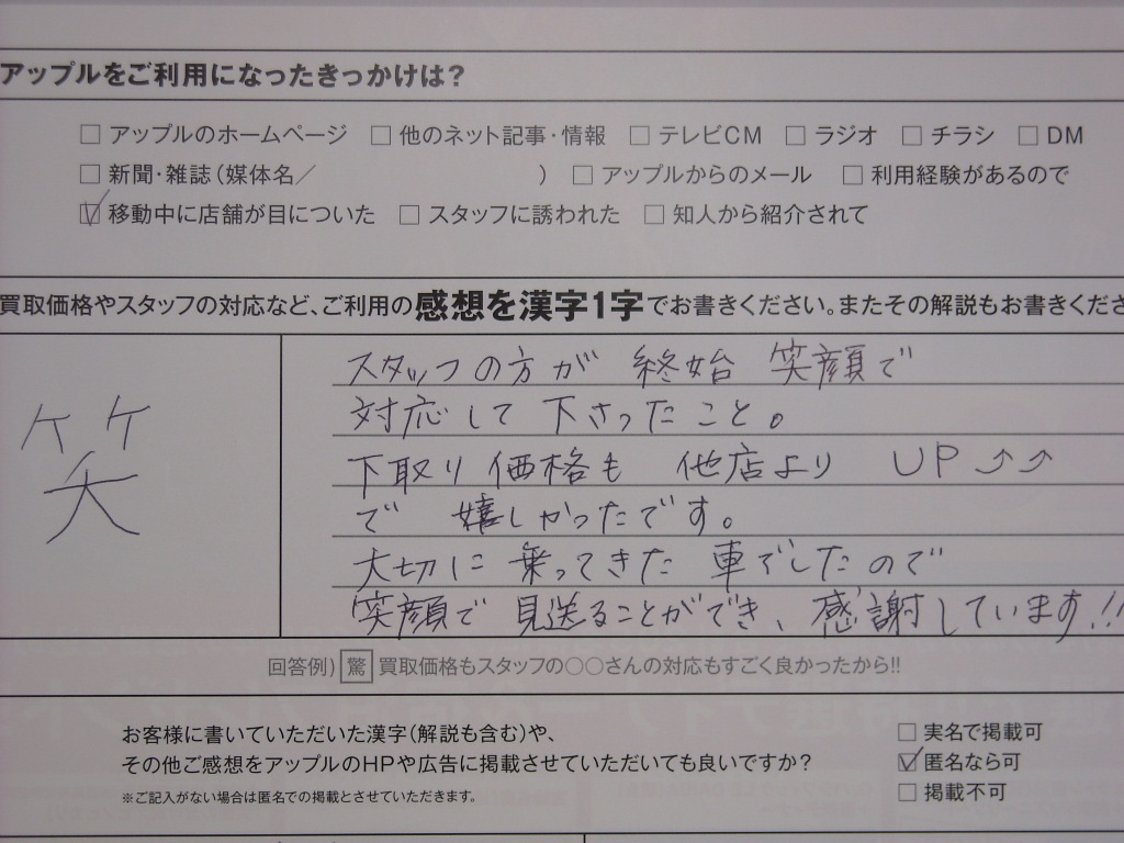 お車のご相談・ 査定だけでもOK! カンタン 入力 30秒 アップルがブランド買取始めました! お電話でも受付中! 受付時間10:00 ~ 18:00最終受付 0438-23-1231 お車のご相談・ 査定だけでもOK! カンタン 入力 30秒 アップルがブランド買取始めました! お電話でも受付中! 受付時間10:00 ~ 18:00最終受付 0438-23-1231 アップルがブランド買取始めました! お電話でも受付中! 受付時間10:00 ~ 18:00最終受付 0438-23-1231 店舗情報 在庫車 スタッフ紹介 ブログ お客様の声 キャンペーン お得 無料査定 click お客様の声 ご記入日: 2009/09/11 T.T様 スタッフの方が終始笑顔で対応してくださったこと。下取り価格も他店よりUP↑↑で嬉しかったです。大切に乗ってきた車でしたので笑顔で見送ることができ、感謝しています!! 前へ 次へ お客様の声一覧を見る