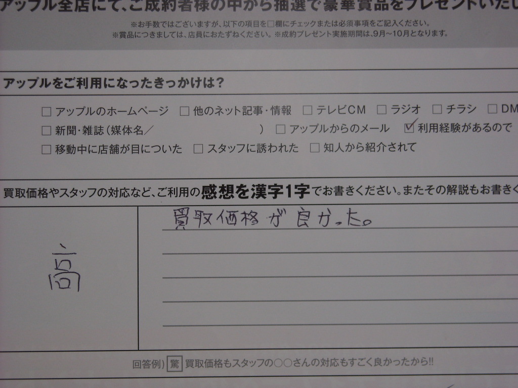 お車のご相談・ 査定だけでもOK! カンタン 入力 30秒 アップルがブランド買取始めました! お電話でも受付中! 受付時間10:00 ~ 18:00最終受付 0438-23-1231 お車のご相談・ 査定だけでもOK! カンタン 入力 30秒 アップルがブランド買取始めました! お電話でも受付中! 受付時間10:00 ~ 18:00最終受付 0438-23-1231 アップルがブランド買取始めました! お電話でも受付中! 受付時間10:00 ~ 18:00最終受付 0438-23-1231 店舗情報 在庫車 スタッフ紹介 ブログ お客様の声 キャンペーン お得 無料査定 click お客様の声 ご記入日: 2009/09/13 小林 雄太郎様 買取価格が良かった。 前へ 次へ お客様の声一覧を見る