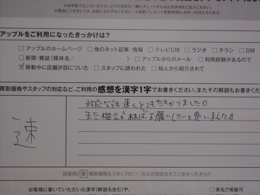 お車のご相談・ 査定だけでもOK! カンタン 入力 30秒 アップルがブランド買取始めました! お電話でも受付中! 受付時間10:00 ~ 18:00最終受付 0438-23-1231 お車のご相談・ 査定だけでもOK! カンタン 入力 30秒 アップルがブランド買取始めました! お電話でも受付中! 受付時間10:00 ~ 18:00最終受付 0438-23-1231 アップルがブランド買取始めました! お電話でも受付中! 受付時間10:00 ~ 18:00最終受付 0438-23-1231 店舗情報 在庫車 スタッフ紹介 ブログ お客様の声 キャンペーン お得 無料査定 click お客様の声 ご記入日: 2009/09/22 K.M様 対応なども速くとてもたすかりました。また機会があればお願いしたいと思いました。 前へ 次へ お客様の声一覧を見る
