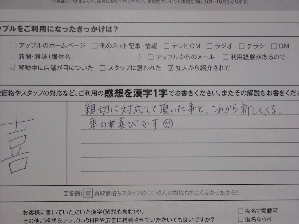 お車のご相談・ 査定だけでもOK! カンタン 入力 30秒 アップルがブランド買取始めました! お電話でも受付中! 受付時間10:00 ~ 18:00最終受付 0438-23-1231 お車のご相談・ 査定だけでもOK! カンタン 入力 30秒 アップルがブランド買取始めました! お電話でも受付中! 受付時間10:00 ~ 18:00最終受付 0438-23-1231 アップルがブランド買取始めました! お電話でも受付中! 受付時間10:00 ~ 18:00最終受付 0438-23-1231 店舗情報 在庫車 スタッフ紹介 ブログ お客様の声 キャンペーン お得 無料査定 click お客様の声 ご記入日: 2009/09/28 K.M様 親切に対応して頂いた事と、これから新しくくる車の喜びです(^^) 前へ 次へ お客様の声一覧を見る