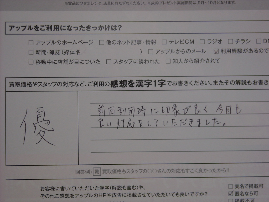 お車のご相談・ 査定だけでもOK! カンタン 入力 30秒 アップルがブランド買取始めました! お電話でも受付中! 受付時間10:00 ~ 18:00最終受付 0438-23-1231 お車のご相談・ 査定だけでもOK! カンタン 入力 30秒 アップルがブランド買取始めました! お電話でも受付中! 受付時間10:00 ~ 18:00最終受付 0438-23-1231 アップルがブランド買取始めました! お電話でも受付中! 受付時間10:00 ~ 18:00最終受付 0438-23-1231 店舗情報 在庫車 スタッフ紹介 ブログ お客様の声 キャンペーン お得 無料査定 click お客様の声 ご記入日: 2009/10/19 K.S様 前回利用時に印象が良く今回も良い対応をしていただきました。 前へ 次へ お客様の声一覧を見る