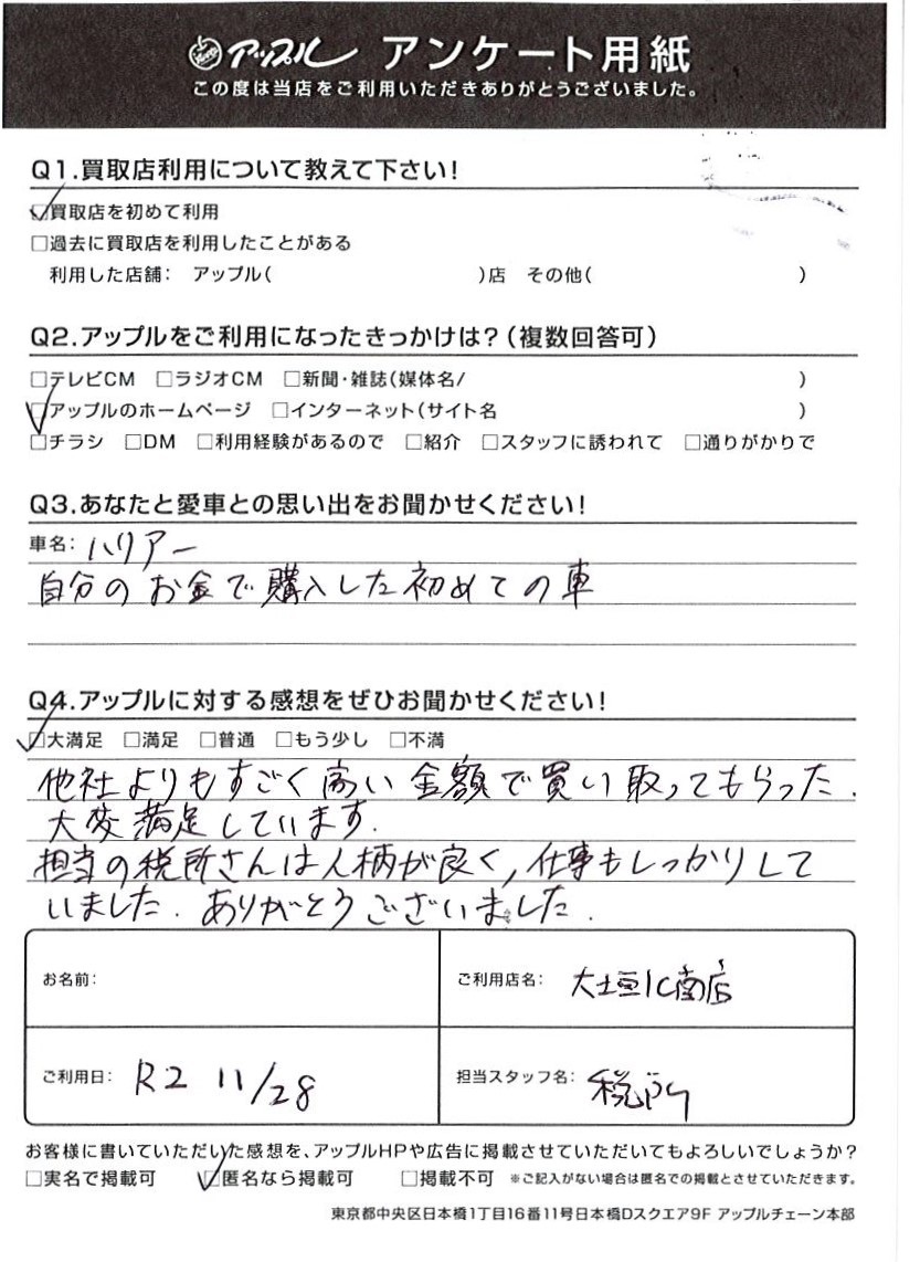 お車のご相談・ 査定だけでもOK! カンタン 入力 30秒 アップルがブランド買取始めました! お電話でも受付中! 受付時間10:00 ~ 19:00 0584-87-0200 お車のご相談・ 査定だけでもOK! カンタン 入力 30秒 アップルがブランド買取始めました! お電話でも受付中! 受付時間10:00 ~ 19:00 0584-87-0200 アップルがブランド買取始めました! お電話でも受付中! 受付時間10:00 ~ 19:00 0584-87-0200 店舗情報 在庫車 スタッフ紹介 ブログ お客様の声 キャンペーン お得 無料査定 click お客様の声 ご記入日: 2020/11/28 匿名希望M様 車名:トヨタ ハリアー (H25年12月~のハイブリッド含む) ◆ 評価 大満足 ◆他社よりもすごく高い値段で買い取ってもらった。大変満足しています。担当の税所さんは人柄が良く、仕事もしっかりしていました。ありがとうございました。 前へ 次へ お客様の声一覧を見る