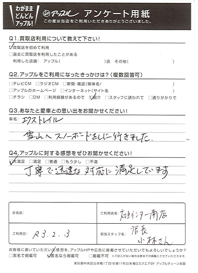 お車のご相談・ 査定だけでもOK! カンタン 入力 30秒 アップルがブランド買取始めました! お電話でも受付中! 受付時間10:00 ~ 19:00 0584-87-0200 お車のご相談・ 査定だけでもOK! カンタン 入力 30秒 アップルがブランド買取始めました! お電話でも受付中! 受付時間10:00 ~ 19:00 0584-87-0200 アップルがブランド買取始めました! お電話でも受付中! 受付時間10:00 ~ 19:00 0584-87-0200 店舗情報 在庫車 スタッフ紹介 ブログ お客様の声 キャンペーン お得 無料査定 click お客様の声 ご記入日: 2021/02/03 匿名希望I様 車名:日産 エクストレイル ◆ 評価 大満足 ◆丁寧で迅速な対応に満足しています。 前へ 次へ お客様の声一覧を見る