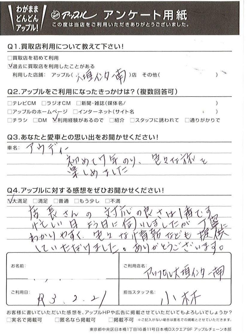 お車のご相談・ 査定だけでもOK! カンタン 入力 30秒 アップルがブランド買取始めました! お電話でも受付中! 受付時間10:00 ~ 19:00 0584-87-0200 お車のご相談・ 査定だけでもOK! カンタン 入力 30秒 アップルがブランド買取始めました! お電話でも受付中! 受付時間10:00 ~ 19:00 0584-87-0200 アップルがブランド買取始めました! お電話でも受付中! 受付時間10:00 ~ 19:00 0584-87-0200 店舗情報 在庫車 スタッフ紹介 ブログ お客様の声 キャンペーン お得 無料査定 click お客様の声 ご記入日: 2021/02/21 匿名希望T様 車名:アウディ Q5 ◆ 評価 大満足 ◆店長さんの対応の良さは1番です。忙しい日よう日に伺いしましたが、丁寧にわかりやすく、色々な情報なども提供していただけました。ありがとうございます。 前へ 次へ お客様の声一覧を見る
