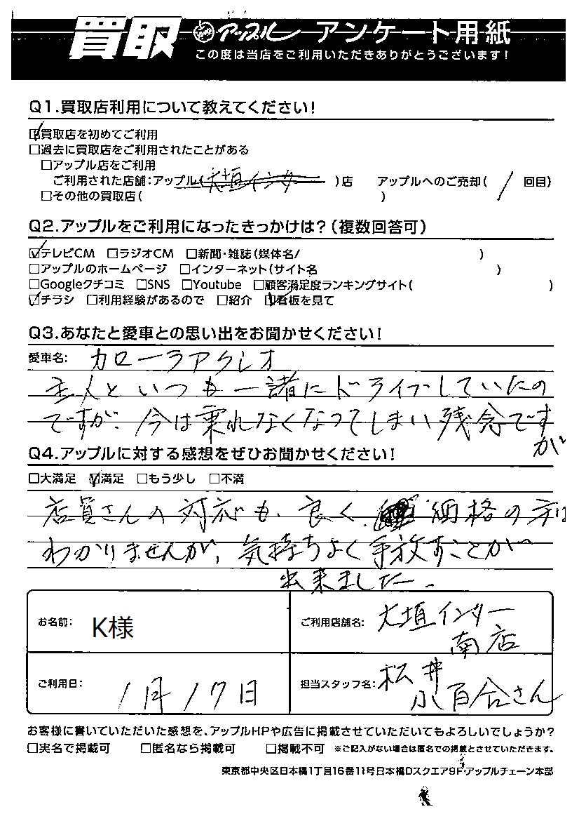 お車のご相談・ 査定だけでもOK! カンタン 入力 30秒 アップルがブランド買取始めました! お電話でも受付中! 受付時間10:00 ~ 19:00 0584-87-0200 お車のご相談・ 査定だけでもOK! カンタン 入力 30秒 アップルがブランド買取始めました! お電話でも受付中! 受付時間10:00 ~ 19:00 0584-87-0200 アップルがブランド買取始めました! お電話でも受付中! 受付時間10:00 ~ 19:00 0584-87-0200 店舗情報 在庫車 スタッフ紹介 ブログ お客様の声 キャンペーン お得 無料査定 click お客様の声 ご記入日: 2022/01/17 K様 車名:トヨタ カローラアクシオ Q あなたと愛車との思い出をお聞かせください!主人といつも一緒にドライブしていたのですが今は乗れなくなってしまい残念ですがQ アップルに対する感想をぜひお聞かせください!感想:満足店員さんの対応も良く、価格の方はわかりませんが気持ちよく手放すことが出来ました。 前へ 次へ お客様の声一覧を見る