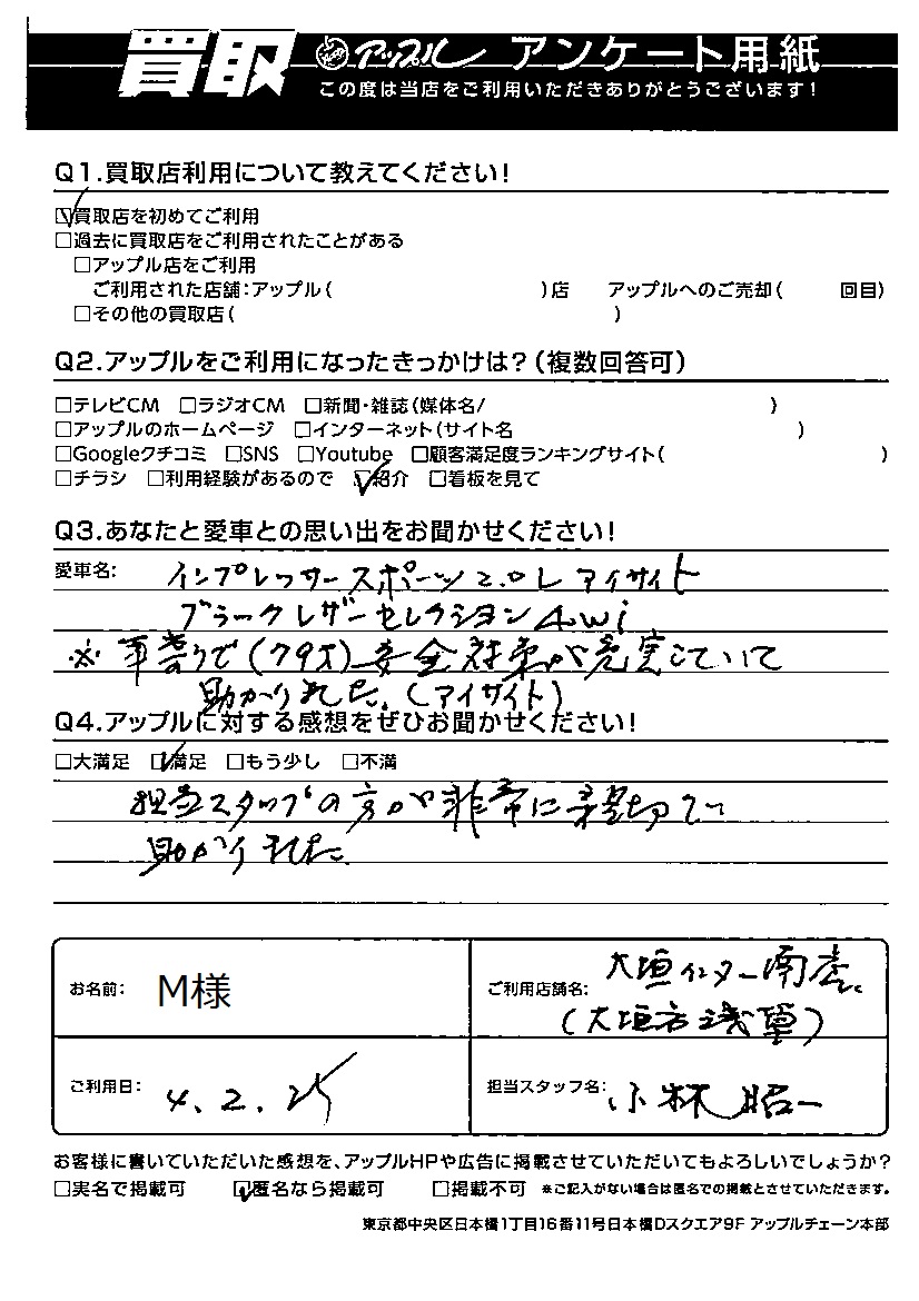 お車のご相談・ 査定だけでもOK! カンタン 入力 30秒 アップルがブランド買取始めました! お電話でも受付中! 受付時間10:00 ~ 19:00 0584-87-0200 お車のご相談・ 査定だけでもOK! カンタン 入力 30秒 アップルがブランド買取始めました! お電話でも受付中! 受付時間10:00 ~ 19:00 0584-87-0200 アップルがブランド買取始めました! お電話でも受付中! 受付時間10:00 ~ 19:00 0584-87-0200 店舗情報 在庫車 スタッフ紹介 ブログ お客様の声 キャンペーン お得 無料査定 click お客様の声 ご記入日: 2022/02/25 M様 車名:スバル インプレッサスポーツ Q あなたと愛車との思い出をお聞かせください!年寄りで(79才)安全対策が充実していて助かりました(アイサイト)Q アップルに対する感想をぜひお聞かせください!感想:満足担当スタッフの方が非常に親切で助かりました。 前へ 次へ お客様の声一覧を見る