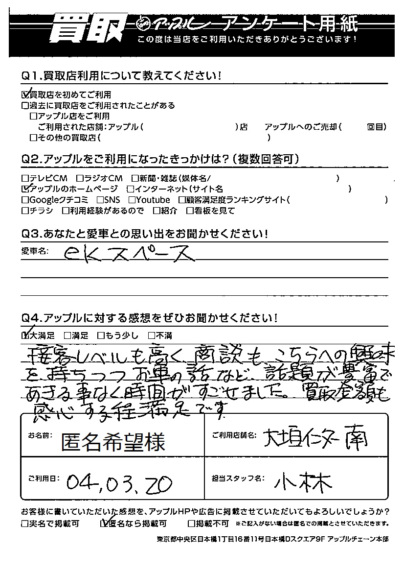 お車のご相談・ 査定だけでもOK! カンタン 入力 30秒 アップルがブランド買取始めました! お電話でも受付中! 受付時間10:00 ~ 19:00 0584-87-0200 お車のご相談・ 査定だけでもOK! カンタン 入力 30秒 アップルがブランド買取始めました! お電話でも受付中! 受付時間10:00 ~ 19:00 0584-87-0200 アップルがブランド買取始めました! お電話でも受付中! 受付時間10:00 ~ 19:00 0584-87-0200 店舗情報 在庫車 スタッフ紹介 ブログ お客様の声 キャンペーン お得 無料査定 click お客様の声 ご記入日: 2022/03/20 匿名希望様 車名:三菱 eKスペース Q アップルに対する感想をぜひお聞かせください!感想:大満足接客レベルも高く商談もこちらへの興味を持ちつつ、お車の話など話題が豊富であきる事なく時間がすごせました。買取金額も感心する程満足です。 前へ 次へ お客様の声一覧を見る