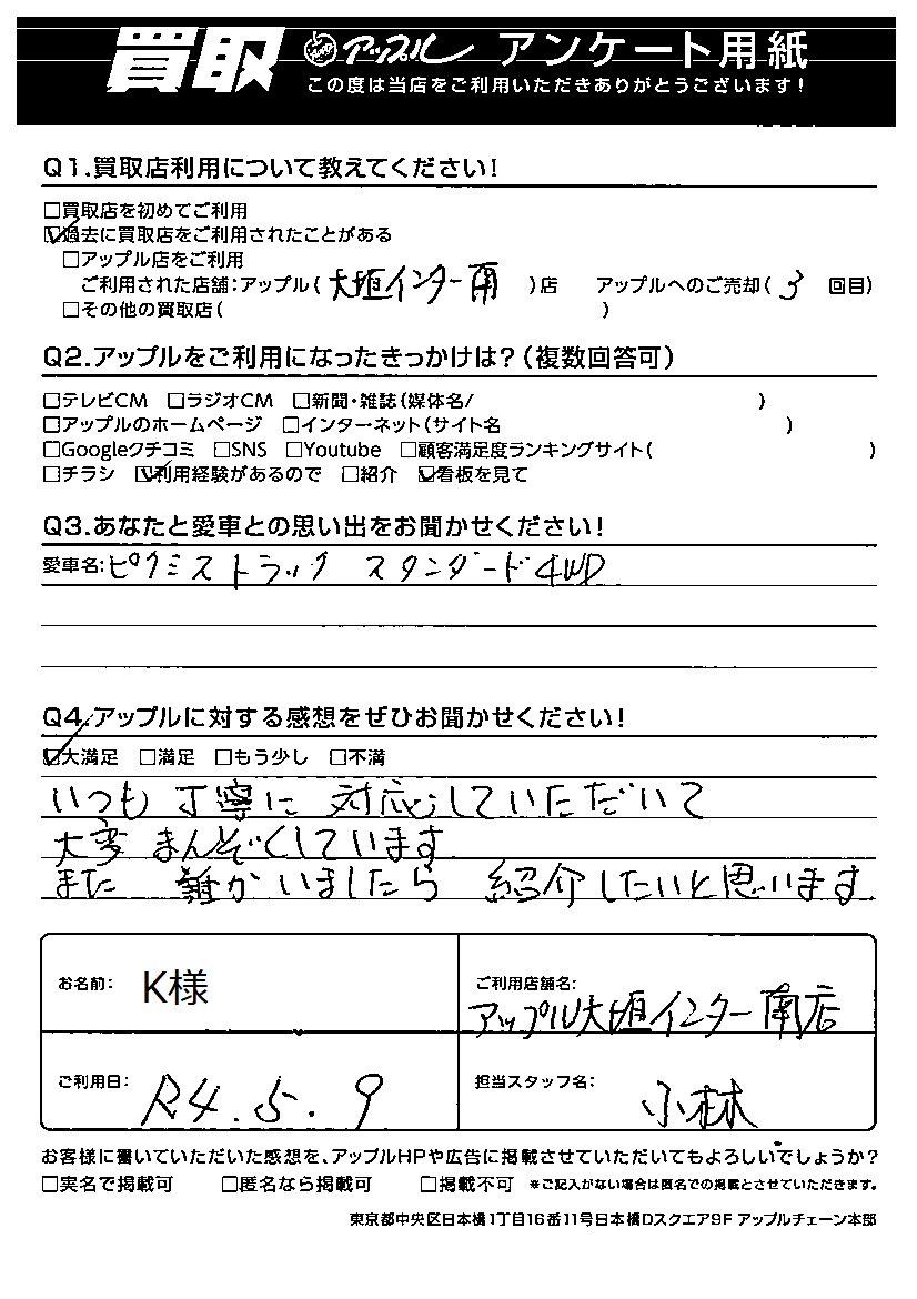 お車のご相談・ 査定だけでもOK! カンタン 入力 30秒 アップルがブランド買取始めました! お電話でも受付中! 受付時間10:00 ~ 19:00 0584-87-0200 お車のご相談・ 査定だけでもOK! カンタン 入力 30秒 アップルがブランド買取始めました! お電話でも受付中! 受付時間10:00 ~ 19:00 0584-87-0200 アップルがブランド買取始めました! お電話でも受付中! 受付時間10:00 ~ 19:00 0584-87-0200 店舗情報 在庫車 スタッフ紹介 ブログ お客様の声 キャンペーン お得 無料査定 click お客様の声 ご記入日: 2022/05/09 K様 車名:トヨタ ピクシストラック Q アップルに対する感想をぜひお聞かせください!感想:大満足いつも丁寧に対応していただいて大変まんぞくしています。また、誰かいましたら紹介したいと思います。 前へ 次へ お客様の声一覧を見る