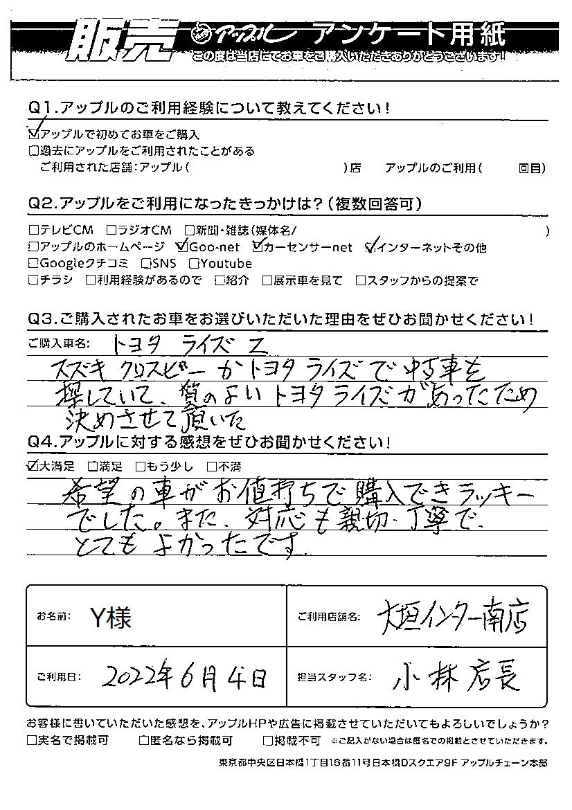 Y様 車名:トヨタ ライズ