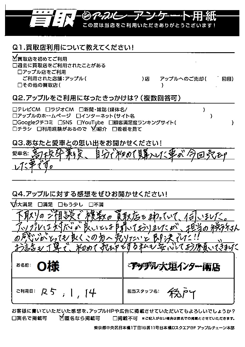 ご利用日:2023/1/14 O 様