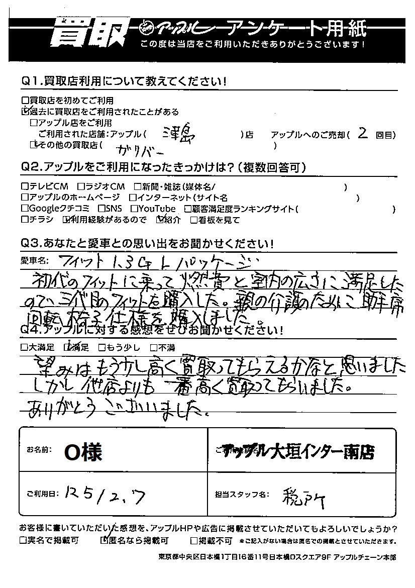 O様 車名:ホンダ フィット(H25年9月以降のハイブリッド含む)