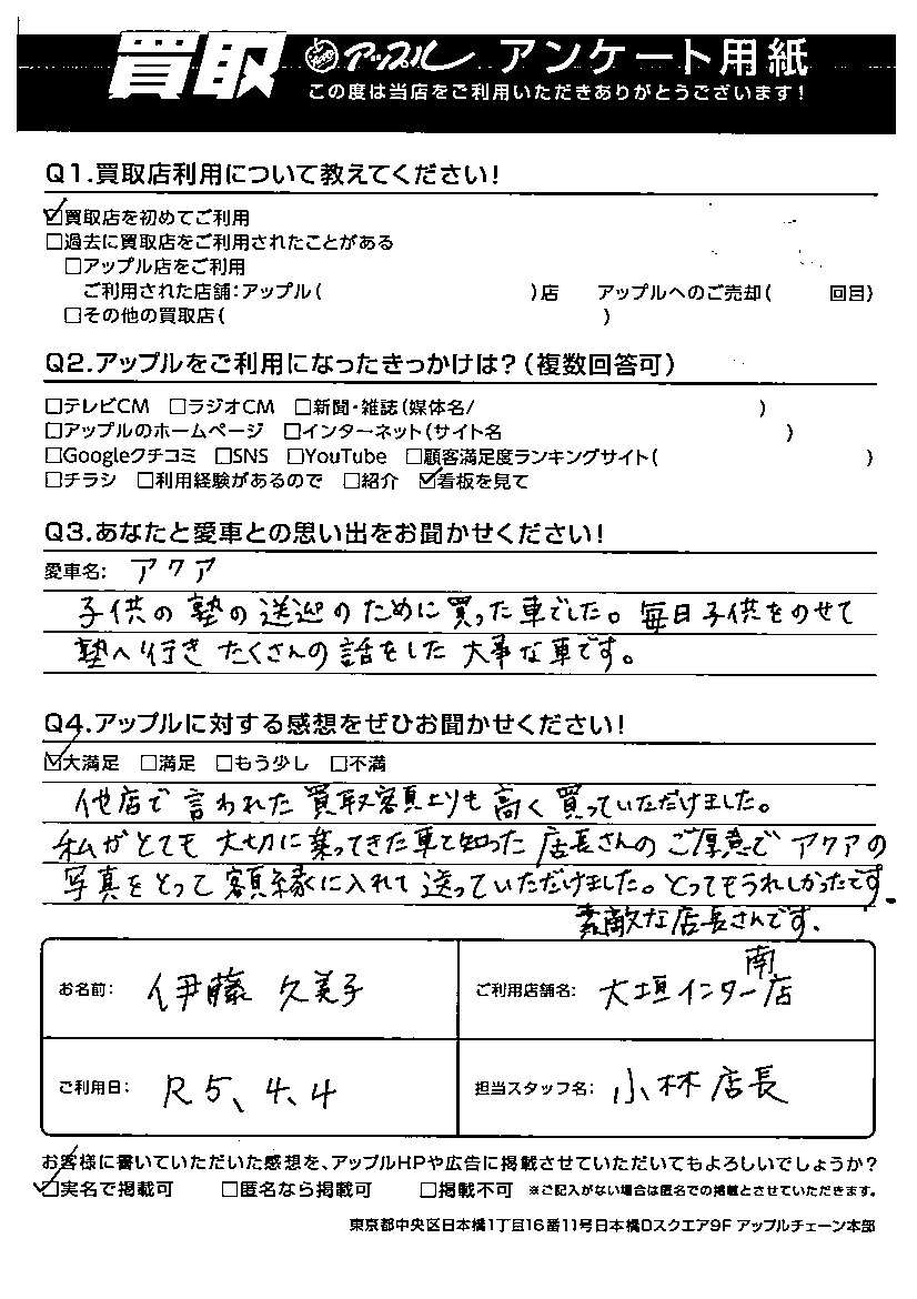伊藤 久美子様 車名:トヨタ アクア
