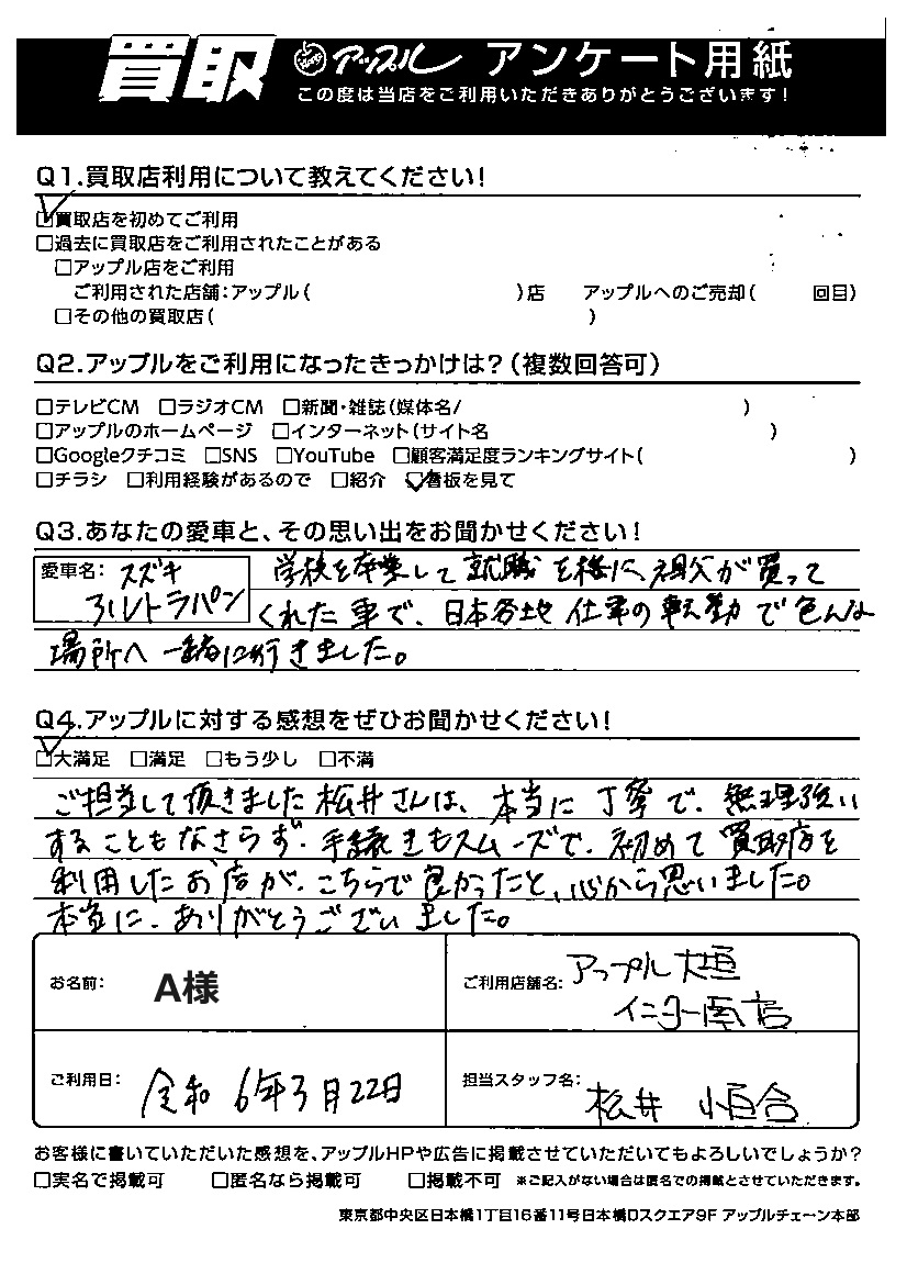 A様 車名:スズキ アルトラパン ラパン(アルト)
