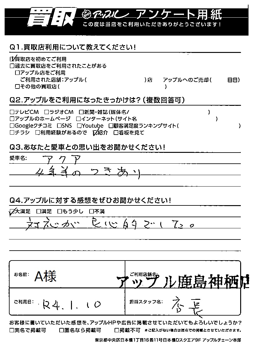 お車のご相談・ 査定だけでもOK! カンタン 入力 30秒 アップルがブランド買取始めました! お電話でも受付中! 受付時間10:00 ~ 18:00 0120-20-3805 お車のご相談・ 査定だけでもOK! カンタン 入力 30秒 アップルがブランド買取始めました! お電話でも受付中! 受付時間10:00 ~ 18:00 0120-20-3805 アップルがブランド買取始めました! お電話でも受付中! 受付時間10:00 ~ 18:00 0120-20-3805 店舗情報 在庫車 スタッフ紹介 ブログ お客様の声 キャンペーン お得 無料査定 click お客様の声 ご記入日: 2022/01/10 A様 車名:トヨタ アクア Q あなたと愛車との思い出をお聞かせください!4年半のつきあいQ アップルに対する感想をぜひお聞かせください!感想:大満足対応が良心的でした。 前へ 次へ お客様の声一覧を見る