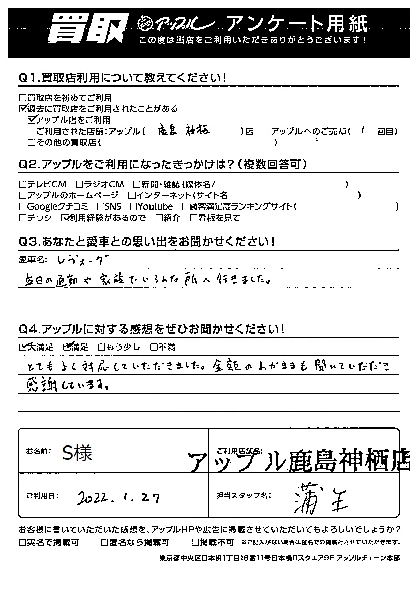 お車のご相談・ 査定だけでもOK! カンタン 入力 30秒 アップルがブランド買取始めました! お電話でも受付中! 受付時間10:00 ~ 18:00 0120-20-3805 お車のご相談・ 査定だけでもOK! カンタン 入力 30秒 アップルがブランド買取始めました! お電話でも受付中! 受付時間10:00 ~ 18:00 0120-20-3805 アップルがブランド買取始めました! お電話でも受付中! 受付時間10:00 ~ 18:00 0120-20-3805 店舗情報 在庫車 スタッフ紹介 ブログ お客様の声 キャンペーン お得 無料査定 click お客様の声 ご記入日: 2022/01/27 S様 車名:スバル レヴォーグ Q あなたと愛車との思い出をお聞かせください!毎日の通勤や家族でいろんな所へ行きました。Q アップルに対する感想をぜひお聞かせください!感想:大満足とてもよく対応していただきました。金額のわがままも聞いていただき感謝しています。 前へ 次へ お客様の声一覧を見る