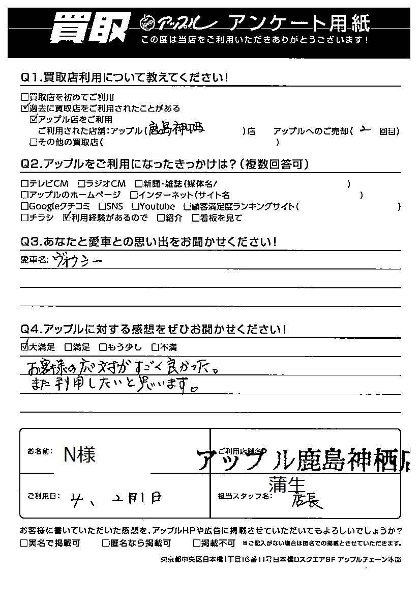 お車のご相談・ 査定だけでもOK! カンタン 入力 30秒 アップルがブランド買取始めました! お電話でも受付中! 受付時間10:00 ~ 18:00 0120-20-3805 お車のご相談・ 査定だけでもOK! カンタン 入力 30秒 アップルがブランド買取始めました! お電話でも受付中! 受付時間10:00 ~ 18:00 0120-20-3805 アップルがブランド買取始めました! お電話でも受付中! 受付時間10:00 ~ 18:00 0120-20-3805 店舗情報 在庫車 スタッフ紹介 ブログ お客様の声 キャンペーン お得 無料査定 click お客様の声 ご記入日: 2022/02/01 N様 車名:トヨタ ヴォクシー Q アップルに対する感想をぜひお聞かせください!感想:大満足お客様の対応がすごく良かった。また利用したいと思います。 前へ 次へ お客様の声一覧を見る