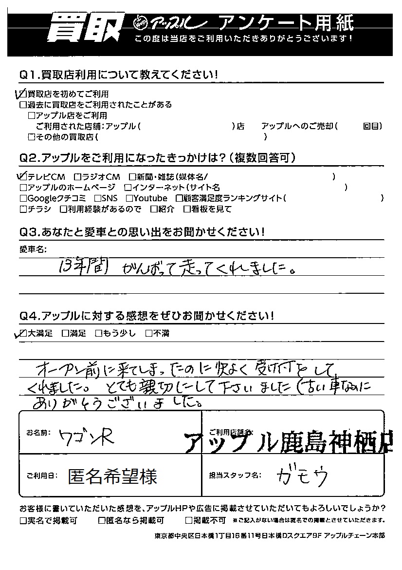 お車のご相談・ 査定だけでもOK! カンタン 入力 30秒 アップルがブランド買取始めました! お電話でも受付中! 受付時間10:00 ~ 18:00 0120-20-3805 お車のご相談・ 査定だけでもOK! カンタン 入力 30秒 アップルがブランド買取始めました! お電話でも受付中! 受付時間10:00 ~ 18:00 0120-20-3805 アップルがブランド買取始めました! お電話でも受付中! 受付時間10:00 ~ 18:00 0120-20-3805 店舗情報 在庫車 スタッフ紹介 ブログ お客様の声 キャンペーン お得 無料査定 click お客様の声 ご記入日: -/-/- 匿名希望様 車名:スズキ ワゴンR Q あなたと愛車との思い出をお聞かせください!13年間がんばって走ってくれました。Q アップルに対する感想をぜひお聞かせください!感想:大満足オープン前に来てしまったのに快よく受け付をしてくれました。とても親切にして下さいました(古い車なのにありがとうございました) 前へ 次へ お客様の声一覧を見る