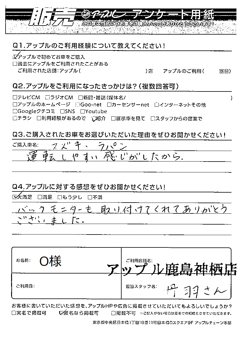 お車のご相談・ 査定だけでもOK! カンタン 入力 30秒 アップルがブランド買取始めました! お電話でも受付中! 受付時間10:00 ~ 18:00 0120-20-3805 お車のご相談・ 査定だけでもOK! カンタン 入力 30秒 アップルがブランド買取始めました! お電話でも受付中! 受付時間10:00 ~ 18:00 0120-20-3805 アップルがブランド買取始めました! お電話でも受付中! 受付時間10:00 ~ 18:00 0120-20-3805 店舗情報 在庫車 スタッフ紹介 ブログ お客様の声 キャンペーン お得 無料査定 click お客様の声 ご記入日: -/-/- O様 車名:スズキ アルトラパン ラパン(アルト) Q ご購入されたお車をお選びいただいた理由をぜひお聞かせください!運転しやすい感じがしたからQ アップルに対する感想をぜひお聞かせください!感想:大満足バックモニターも取り付けてくれてありがとうございました。 前へ 次へ お客様の声一覧を見る