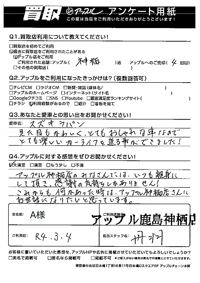 A様 車名:スズキ アルトラパン ラパン(アルト)