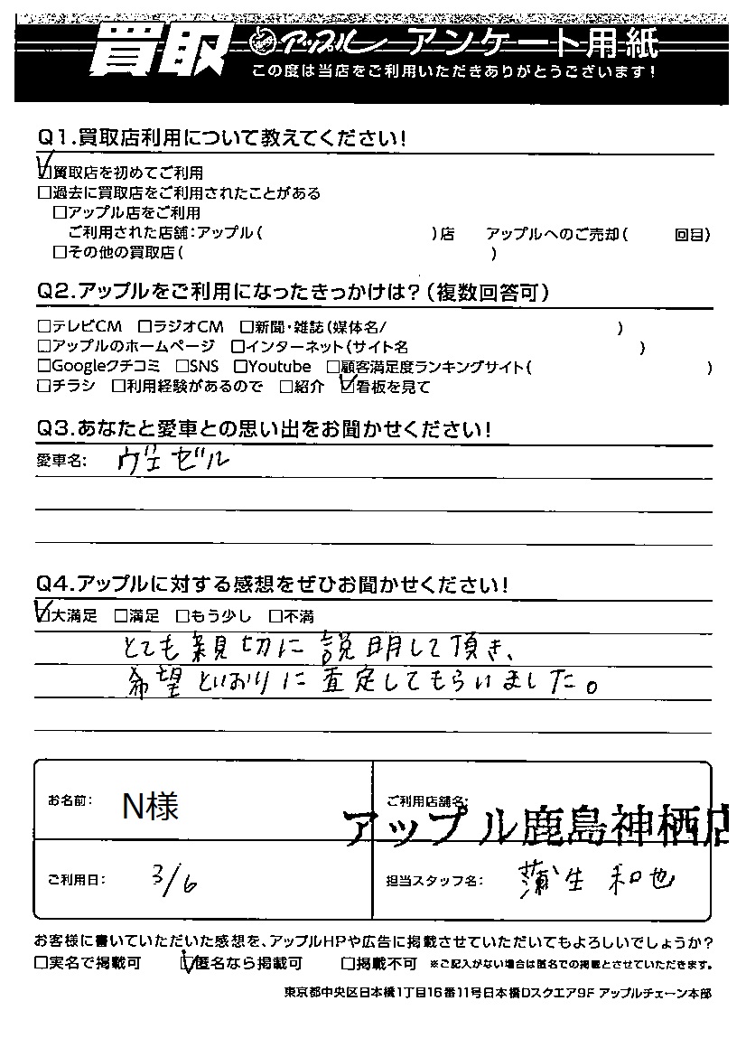 お車のご相談・ 査定だけでもOK! カンタン 入力 30秒 アップルがブランド買取始めました! お電話でも受付中! 受付時間10:00 ~ 18:00 0120-20-3805 お車のご相談・ 査定だけでもOK! カンタン 入力 30秒 アップルがブランド買取始めました! お電話でも受付中! 受付時間10:00 ~ 18:00 0120-20-3805 アップルがブランド買取始めました! お電話でも受付中! 受付時間10:00 ~ 18:00 0120-20-3805 店舗情報 在庫車 スタッフ紹介 ブログ お客様の声 キャンペーン お得 無料査定 click お客様の声 ご記入日: 2022/03/06 N様 車名:ホンダ ヴェゼル Q アップルに対する感想をぜひお聞かせください!感想:大満足とても親切に説明して頂き、希望どおりに査定してもらいました。 前へ 次へ お客様の声一覧を見る