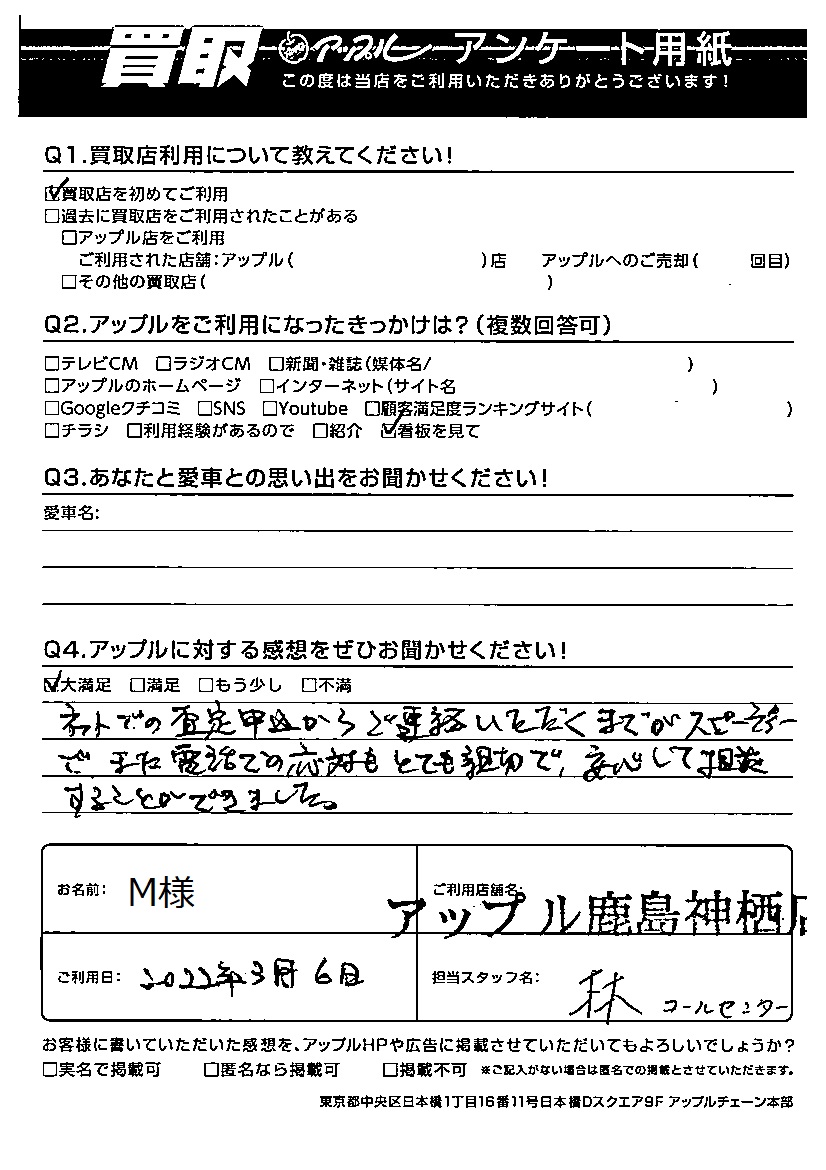 お車のご相談・ 査定だけでもOK! カンタン 入力 30秒 アップルがブランド買取始めました! お電話でも受付中! 受付時間10:00 ~ 18:00 0120-20-3805 お車のご相談・ 査定だけでもOK! カンタン 入力 30秒 アップルがブランド買取始めました! お電話でも受付中! 受付時間10:00 ~ 18:00 0120-20-3805 アップルがブランド買取始めました! お電話でも受付中! 受付時間10:00 ~ 18:00 0120-20-3805 店舗情報 在庫車 スタッフ紹介 ブログ お客様の声 キャンペーン お得 無料査定 click お客様の声 ご記入日: 2022/03/06 M様 Q アップルに対する感想をぜひお聞かせください!ネットでの査定申込からご連絡いただくまでがスピーディーでまた電話での対応もとても親切で、安心して相談することができました。 前へ 次へ お客様の声一覧を見る