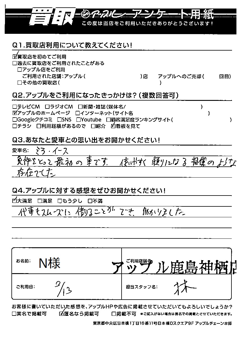 お車のご相談・ 査定だけでもOK! カンタン 入力 30秒 アップルがブランド買取始めました! お電話でも受付中! 受付時間10:00 ~ 18:00 0120-20-3805 お車のご相談・ 査定だけでもOK! カンタン 入力 30秒 アップルがブランド買取始めました! お電話でも受付中! 受付時間10:00 ~ 18:00 0120-20-3805 アップルがブランド買取始めました! お電話でも受付中! 受付時間10:00 ~ 18:00 0120-20-3805 店舗情報 在庫車 スタッフ紹介 ブログ お客様の声 キャンペーン お得 無料査定 click お客様の声 ご記入日: 2022/02/13 N様 車名:ダイハツ ミライース Q あなたと愛車との思い出をお聞かせください!免許をとって最初の車です。使いやすく頼りになる相棒のような存在でした。Q アップルに対する感想をぜひお聞かせください!感想:大満足代車もスムーズに借りることができ、助かりました。 前へ 次へ お客様の声一覧を見る