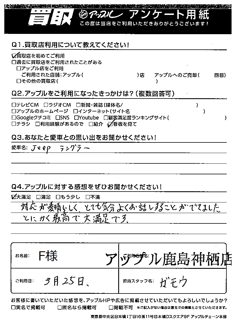 お車のご相談・ 査定だけでもOK! カンタン 入力 30秒 アップルがブランド買取始めました! お電話でも受付中! 受付時間10:00 ~ 18:00 0120-20-3805 お車のご相談・ 査定だけでもOK! カンタン 入力 30秒 アップルがブランド買取始めました! お電話でも受付中! 受付時間10:00 ~ 18:00 0120-20-3805 アップルがブランド買取始めました! お電話でも受付中! 受付時間10:00 ~ 18:00 0120-20-3805 店舗情報 在庫車 スタッフ紹介 ブログ お客様の声 キャンペーン お得 無料査定 click お客様の声 ご記入日: 2022/03/25 F様 車名:ジープ ラングラー Q アップルに対する感想をぜひお聞かせください!感想:大満足対応が素晴らしく、とても気分よくお話しすることができました。とにかく最高で大満足です。 前へ 次へ お客様の声一覧を見る