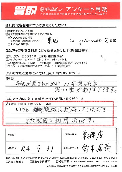 お車のご相談・ 査定だけでもOK! カンタン 入力 30秒 アップルがブランド買取始めました! お電話でも受付中! 受付時間9:30 ~ 18:30 0561-38-8448 お車のご相談・ 査定だけでもOK! カンタン 入力 30秒 アップルがブランド買取始めました! お電話でも受付中! 受付時間9:30 ~ 18:30 0561-38-8448 アップルがブランド買取始めました! お電話でも受付中! 受付時間9:30 ~ 18:30 0561-38-8448 店舗情報 在庫車 スタッフ紹介 ブログ お客様の声 キャンペーン 無料査定 click お客様の声 ご記入日: 2022/07/31 S様 車名:ダイハツ タント 満足度★★★★★いつも親切に対応していただきまた次回も利用したいです。 前へ 次へ お客様の声一覧を見る