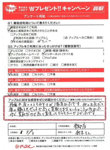 お車のご相談・ 査定だけでもOK! カンタン 入力 30秒 アップルがブランド買取始めました! お電話でも受付中! 受付時間9:30 ~ 18:30 0561-38-8448 お車のご相談・ 査定だけでもOK! カンタン 入力 30秒 アップルがブランド買取始めました! お電話でも受付中! 受付時間9:30 ~ 18:30 0561-38-8448 アップルがブランド買取始めました! お電話でも受付中! 受付時間9:30 ~ 18:30 0561-38-8448 店舗情報 在庫車 スタッフ紹介 ブログ お客様の声 キャンペーン 無料査定 click お客様の声 ご記入日: 2023/09/03 S様 車名:日産 キャラバン 満足度★★★★★接客や店への入りやすさが一番良かったです。他のお店だと 車の購入もセットで高く買い取りますというところが多かったけど、買取だけで高く査定してもらえたのがよかったです。 前へ 次へ お客様の声一覧を見る