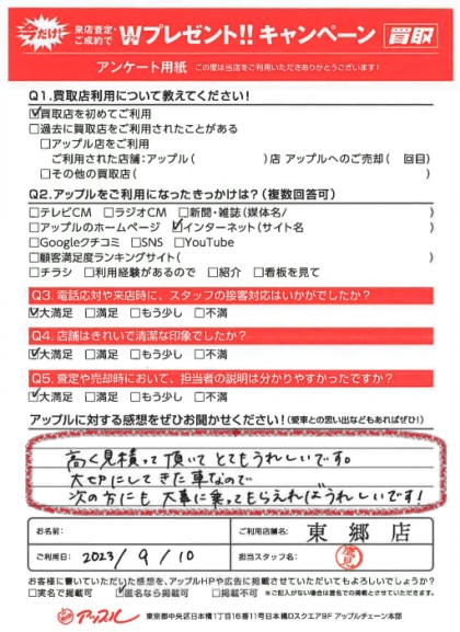 お車のご相談・ 査定だけでもOK! カンタン 入力 30秒 アップルがブランド買取始めました! お電話でも受付中! 受付時間9:30 ~ 18:30 0561-38-8448 お車のご相談・ 査定だけでもOK! カンタン 入力 30秒 アップルがブランド買取始めました! お電話でも受付中! 受付時間9:30 ~ 18:30 0561-38-8448 アップルがブランド買取始めました! お電話でも受付中! 受付時間9:30 ~ 18:30 0561-38-8448 店舗情報 在庫車 スタッフ紹介 ブログ お客様の声 キャンペーン 無料査定 click お客様の声 ご記入日: 2023/09/10 T様 車名:ダイハツ ウェイク 満足度★★★★★高く見積もって頂いてとてもうれしいです。大切にしてきた車なので、次の方にも大事に乗ってもらえればうれしいです! 前へ 次へ お客様の声一覧を見る