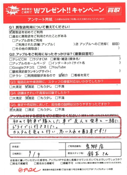 お車のご相談・ 査定だけでもOK! カンタン 入力 30秒 アップルがブランド買取始めました! お電話でも受付中! 受付時間9:30 ~ 18:30 0561-38-8448 お車のご相談・ 査定だけでもOK! カンタン 入力 30秒 アップルがブランド買取始めました! お電話でも受付中! 受付時間9:30 ~ 18:30 0561-38-8448 アップルがブランド買取始めました! お電話でも受付中! 受付時間9:30 ~ 18:30 0561-38-8448 店舗情報 在庫車 スタッフ紹介 ブログ お客様の声 キャンペーン 無料査定 click お客様の声 ご記入日: 2023/09/09 T様 車名:トヨタ ハイラックス 満足度★★★★★初めて新車で購入した車で、友人と愛車と一緒にドライブに行きました。カスタムも色々と行い、思い入れのある車です!! 前へ 次へ お客様の声一覧を見る