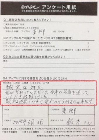 誠実な対応。前回買取っていただいた愛車の写真を送っていただき感動しました。