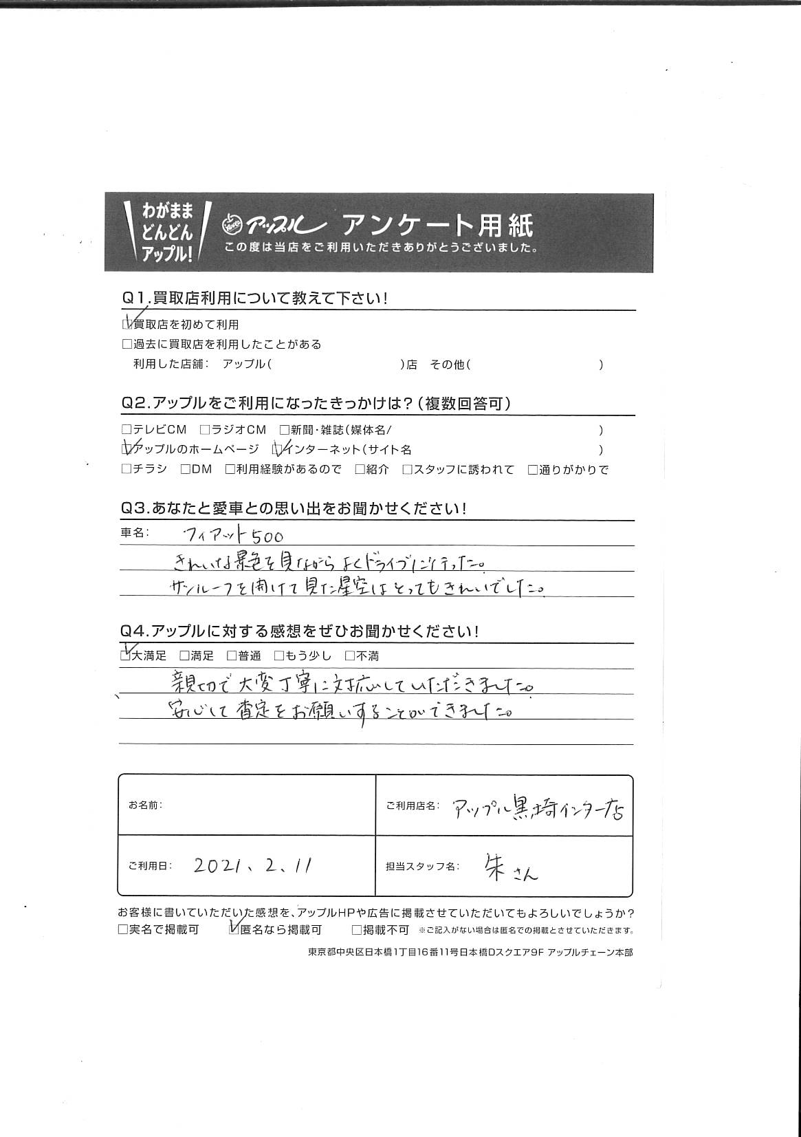 お車のご相談・ 査定だけでもOK! カンタン 入力 30秒 アップルがブランド買取始めました! お電話でも受付中! 受付時間10:00 ~ 18:30 0120-556-522 お車のご相談・ 査定だけでもOK! カンタン 入力 30秒 アップルがブランド買取始めました! お電話でも受付中! 受付時間10:00 ~ 18:30 0120-556-522 アップルがブランド買取始めました! お電話でも受付中! 受付時間10:00 ~ 18:30 0120-556-522 店舗情報 在庫車 スタッフ紹介 ブログ お客様の声 キャンペーン お得 無料査定 click お客様の声 ご記入日: 2021/02/11 K様 車名:フィアット 500(チンクエチェント) フィアット500きれいな景色を見ながらよくドライブに行った。サンルーフを開けて見た星空はとってもきれいでした。親切で大変丁寧に対応して頂きました。安心して査定をお願いすることができました。 前へ 次へ お客様の声一覧を見る