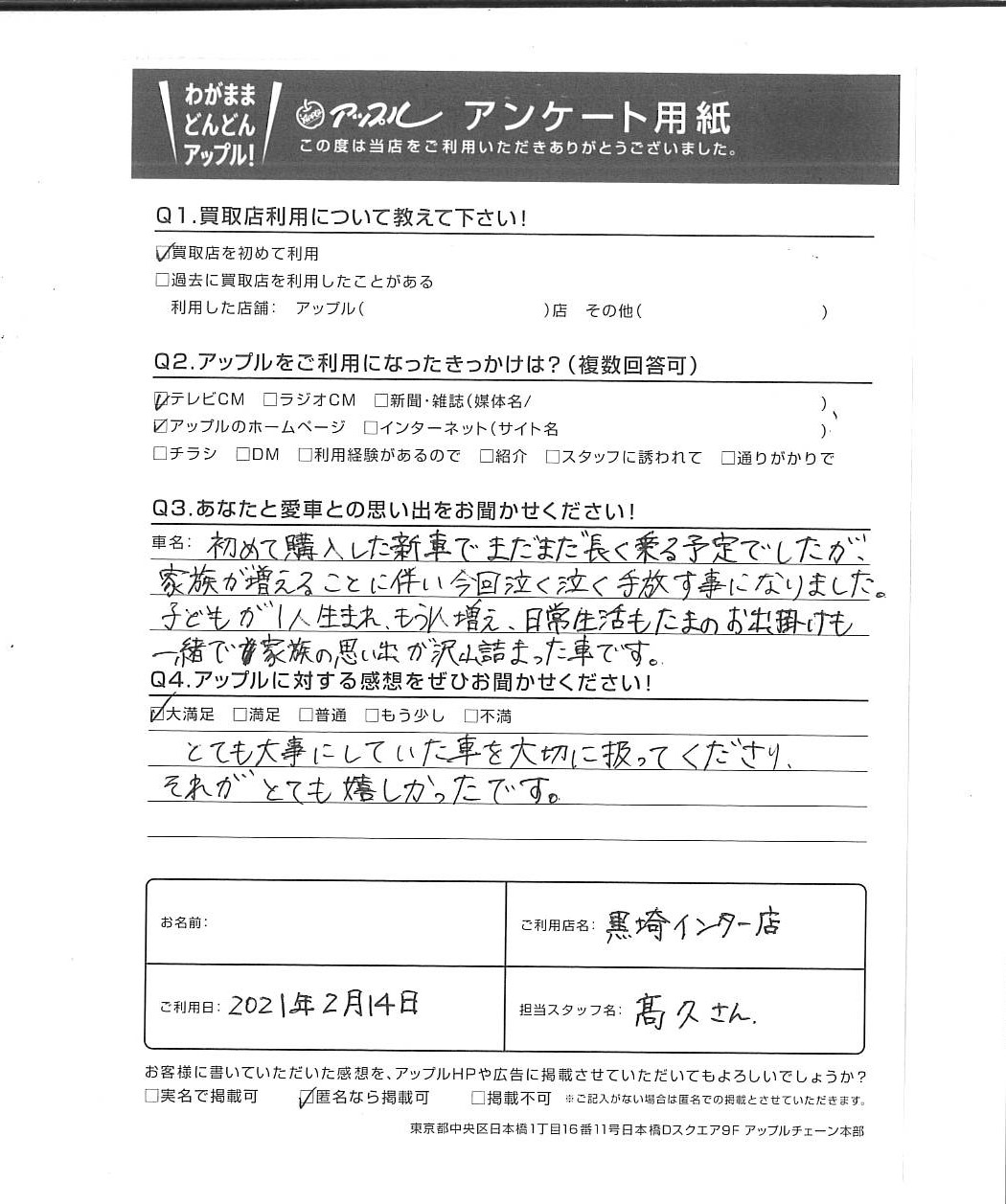 初めて購入した新車でまだまだ長く乗る予定でしたが、家族が増えることに伴い今回泣く泣く手放す事になりました。