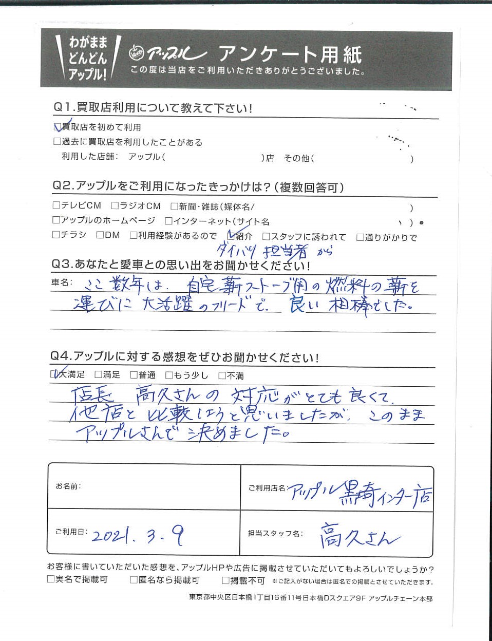 店長 高久さんの対応がとても良くて、他店と比較しようと思いましたが、