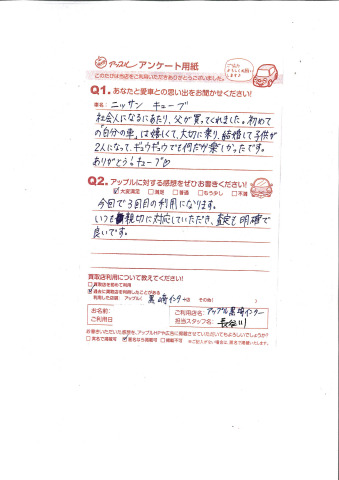 お車のご相談・ 査定だけでもOK! カンタン 入力 30秒 アップルがブランド買取始めました! お電話でも受付中! 受付時間10:00 ~ 18:30 0120-556-522 お車のご相談・ 査定だけでもOK! カンタン 入力 30秒 アップルがブランド買取始めました! お電話でも受付中! 受付時間10:00 ~ 18:30 0120-556-522 アップルがブランド買取始めました! お電話でも受付中! 受付時間10:00 ~ 18:30 0120-556-522 店舗情報 在庫車 スタッフ紹介 ブログ お客様の声 キャンペーン お得 無料査定 click お客様の声 ご記入日: 2013/11/29 S様 社会人になるにあたり、父が買ってくれました。初めての『自分の車』は嬉しくて、大切に乗り結婚して子供が2人になってギュウギュウでも何だか楽しかったです。ありがとう!キューブ?今回で3回目の利用になります。いつも親切に対応していただき、査定も明確で良いです。 前へ 次へ お客様の声一覧を見る