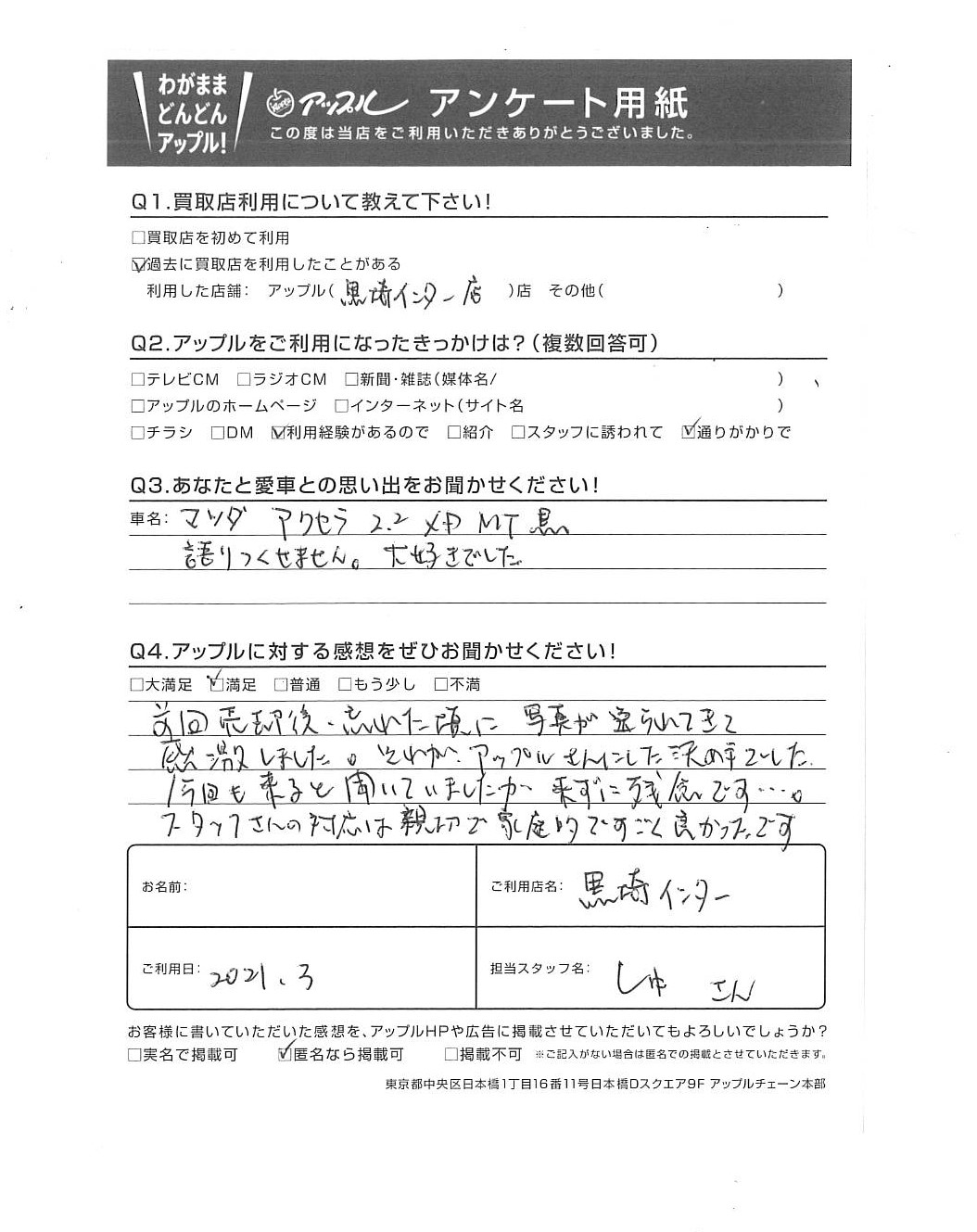 O様 車名:マツダ アクセラスポーツ