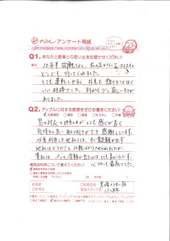 以前利用した他社では、すぐ査定額が出ず、他社はどうだ?と比較ばかりさせられましたが貴社はパッと金額が出たのはとても良かったです。