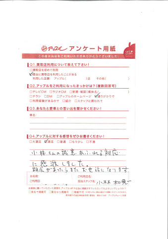 お車のご相談・ 査定だけでもOK! カンタン 入力 30秒 アップルがブランド買取始めました! お電話でも受付中! 受付時間10:00 ~ 18:30 0120-556-522 お車のご相談・ 査定だけでもOK! カンタン 入力 30秒 アップルがブランド買取始めました! お電話でも受付中! 受付時間10:00 ~ 18:30 0120-556-522 アップルがブランド買取始めました! お電話でも受付中! 受付時間10:00 ~ 18:30 0120-556-522 店舗情報 在庫車 スタッフ紹介 ブログ お客様の声 キャンペーン お得 無料査定 click お客様の声 ご記入日: 2014/04/25 S様 小林さんの誠意あふれる対応に感激しました。機会があったらまたお世話になります。 前へ 次へ お客様の声一覧を見る