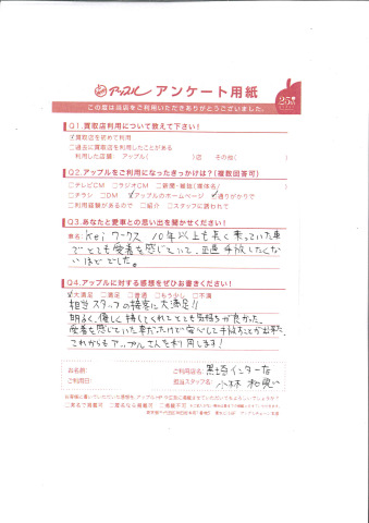 お車のご相談・ 査定だけでもOK! カンタン 入力 30秒 アップルがブランド買取始めました! お電話でも受付中! 受付時間10:00 ~ 18:30 0120-556-522 お車のご相談・ 査定だけでもOK! カンタン 入力 30秒 アップルがブランド買取始めました! お電話でも受付中! 受付時間10:00 ~ 18:30 0120-556-522 アップルがブランド買取始めました! お電話でも受付中! 受付時間10:00 ~ 18:30 0120-556-522 店舗情報 在庫車 スタッフ紹介 ブログ お客様の声 キャンペーン お得 無料査定 click お客様の声 ご記入日: 2014/04/21 A様 10年以上も長く乗っていた車でとても愛着を感じていて、正直手放したくないほどでした。担当スタッフの接客に大満足!!明るく、優しく接してくれてとても気持ちが良かった。愛着を感じていた車だったけど安心して手放すことが出来た。これからもアップルさんを利用します! 前へ 次へ お客様の声一覧を見る
