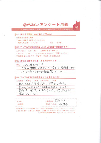 お車のご相談・ 査定だけでもOK! カンタン 入力 30秒 アップルがブランド買取始めました! お電話でも受付中! 受付時間10:00 ~ 18:30 0120-556-522 お車のご相談・ 査定だけでもOK! カンタン 入力 30秒 アップルがブランド買取始めました! お電話でも受付中! 受付時間10:00 ~ 18:30 0120-556-522 アップルがブランド買取始めました! お電話でも受付中! 受付時間10:00 ~ 18:30 0120-556-522 店舗情報 在庫車 スタッフ紹介 ブログ お客様の声 キャンペーン お得 無料査定 click お客様の声 ご記入日: 2014/05/03 O様 丸型のデザインで今でも普段乗りできスーパーチャージャーで加速感がいい。対応された方が親切、丁寧でよかった。思い入れのある車で20年前の車だったので最後まで乗ろうかまよっていたので次の方にも乗ってもらいたい。 前へ 次へ お客様の声一覧を見る