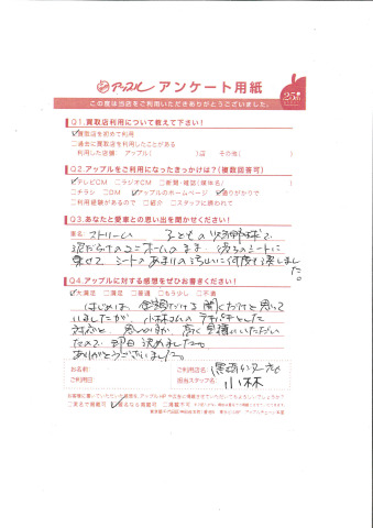 お車のご相談・ 査定だけでもOK! カンタン 入力 30秒 アップルがブランド買取始めました! お電話でも受付中! 受付時間10:00 ~ 18:30 0120-556-522 お車のご相談・ 査定だけでもOK! カンタン 入力 30秒 アップルがブランド買取始めました! お電話でも受付中! 受付時間10:00 ~ 18:30 0120-556-522 アップルがブランド買取始めました! お電話でも受付中! 受付時間10:00 ~ 18:30 0120-556-522 店舗情報 在庫車 スタッフ紹介 ブログ お客様の声 キャンペーン お得 無料査定 click お客様の声 ご記入日: 2014/05/09 S様 子どもの野球で泥だらけのユニホームのまま後ろのシートに乗せてシートのあまりの汚れに何度も涙しました。はじめは金額だけを聞くだけと思っていましたが、小林さんのテキパキとした対応と思いのほか高く見積りいただいたので即日決めました。ありがとうございました。 前へ 次へ お客様の声一覧を見る