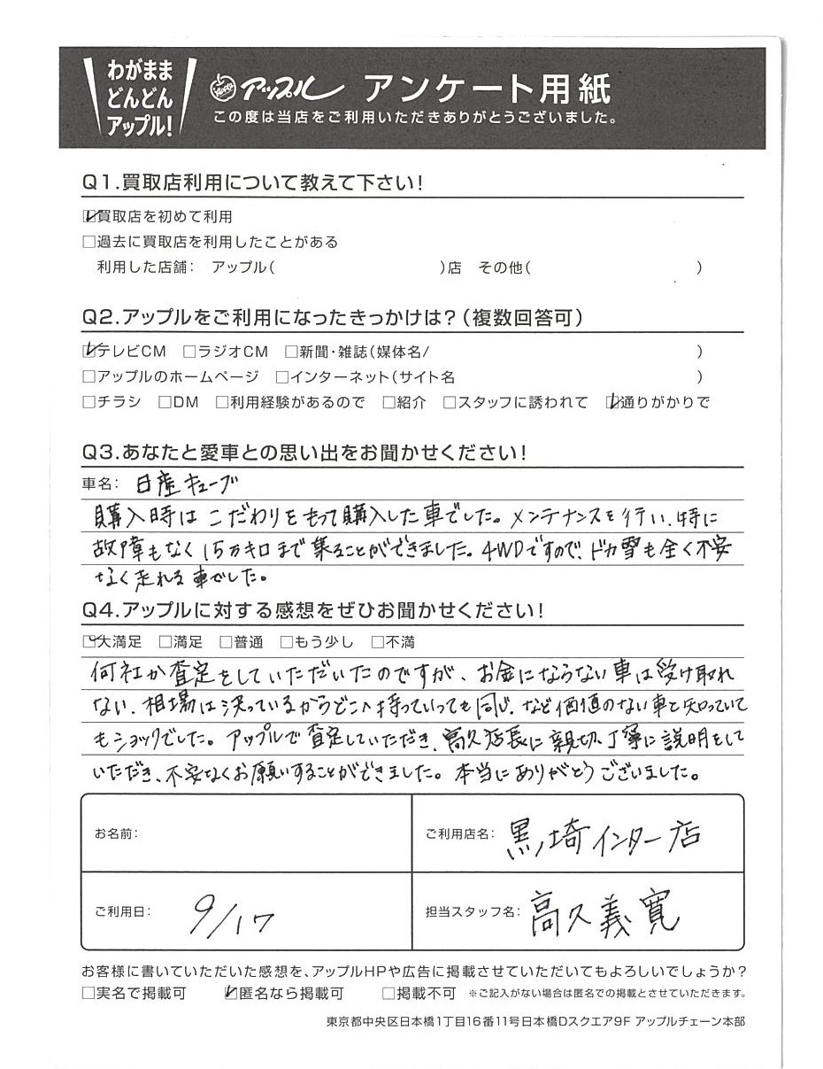 アップルで査定していただき、高久店長に親切、丁寧に説明をしていただき、不安なくお願いすることが