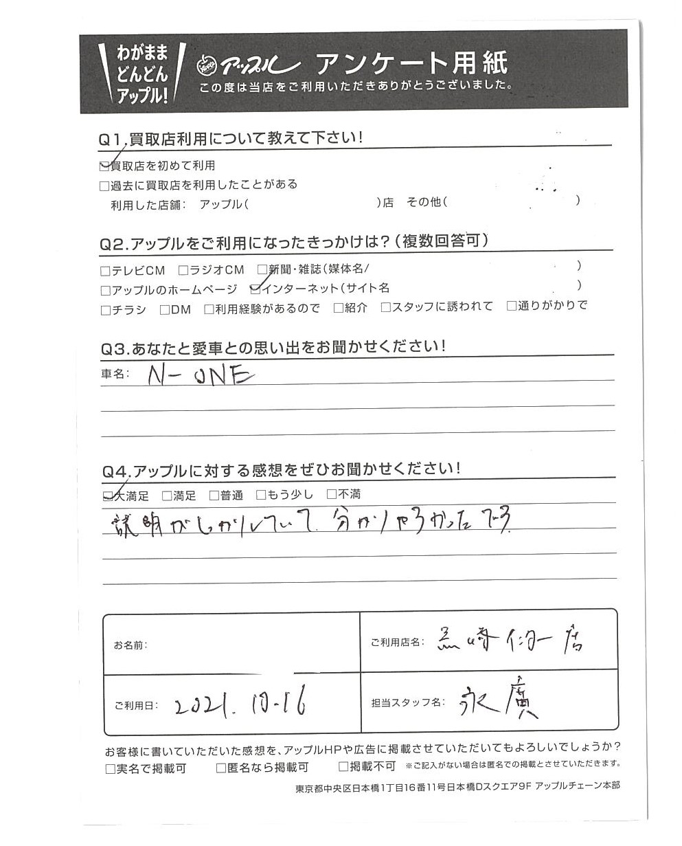 お車のご相談・ 査定だけでもOK! カンタン 入力 30秒 アップルがブランド買取始めました! お電話でも受付中! 受付時間10:00 ~ 18:30 0120-556-522 お車のご相談・ 査定だけでもOK! カンタン 入力 30秒 アップルがブランド買取始めました! お電話でも受付中! 受付時間10:00 ~ 18:30 0120-556-522 アップルがブランド買取始めました! お電話でも受付中! 受付時間10:00 ~ 18:30 0120-556-522 店舗情報 在庫車 スタッフ紹介 ブログ お客様の声 キャンペーン お得 無料査定 click お客様の声 ご記入日: 2021/10/16 新潟県新潟市 A様 車名:ホンダ N-ONE Q2:あなたと愛車との思い出をお聞かせください!車名:N-ONEQ3:アップルに対する感想をぜひお聞かせください!☑大満足説明がしっかりしていて、分かりやすかったです。 前へ 次へ お客様の声一覧を見る